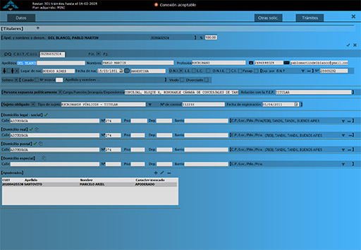 En este panel se ingresa el/los titular/es registral/es. Los mismos pueden ser PH o PJ. Soporta condominio y apoderados.