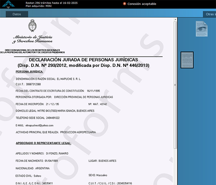 Algunos de los datos más comunes a cargar en nuestro sistema son por ejemplo un titular registral, un acreedor prendario, un tomador de leasing, un mandatario, etc. El dato común a todos ellos es el Nº de C.U.I.T. o C.U.I.L. Es por ello que cuando el usuario ingresa tal Nº en el sistema, Autoforms detecta si otro usuario, en otro lugar del país ya lo cargó. Si esto fuera así, Autoforms le muestra los datos para que usted los incorpore a su espacio de trabajo sin necesidad de cargar nuevamente todos los campos requeridos.