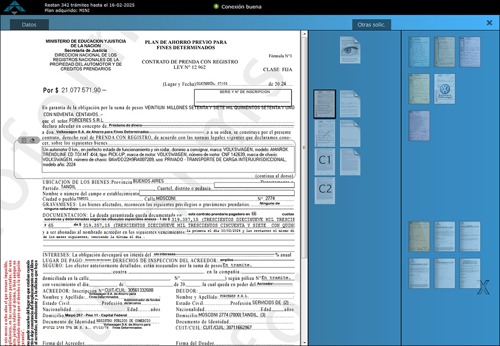 He aquí unos de los paneles principales de Autoforms. En el mismo se selecciona al acreedor prendario, sus apoderados, datos para la S.T. 03, contrato, continuaciones y anexos, como así también todo lo que tiene que ver con las tasas, deudores solidarios, garantes, etc.